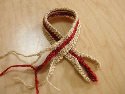 くさり編みと細編みだけで編んだミニマフラー。 かぎ針あみで作ります。これは五号の針を使ってます。 |