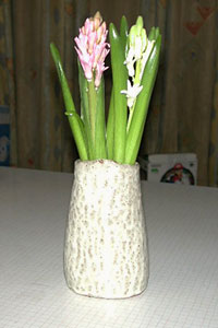 ヒヤシンスにぴったんこの厚み。この写真でおわかりのように、マヨネーズ花瓶は花代節約花瓶でもあるのだ。一輪挿しでは淋しいけど花束ほどのボリュームはないときに大活躍。かな?