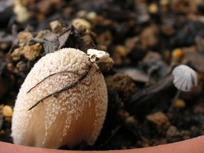 同じ腐葉土を使っているお宅でも、このキノコが出ているんだろうなと思うと面白い。コバエも出るしねえ。この腐葉土はハズレをひいたみたいだ。