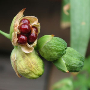 ●大きなタネをつけ、もう夏の休眠期に入るだろうと思われたヒメヒオウギがまた花をつけた。涼しかった五月の置きみやげのようで面白い。