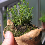 涼しい田舎育ちは、酷暑のベランダでは生き抜けないのかしら。とりあえず、苔を貼りたかった鉢に入れて様子を見てみる。