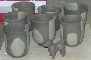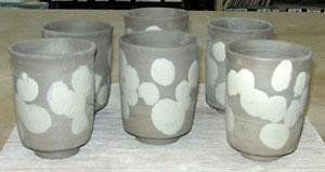 25日にロクロでひいた湯飲みを6個削って白化粧。これは波とシギの図柄に擦る計画。写真で見ると波がミミズに見えるのが面白い。