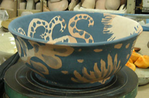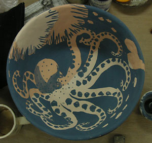 ●ようやく落ち着いて大鉢に絵付けができた。以前クラゲ皿を作ったのだが、それと同じ効果を狙ってみる。本焼きでうまく効果が出ますように。祈っているのが面白い。