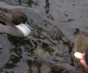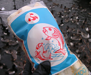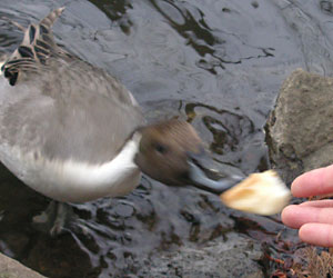 ●カモ気の無い場所で餌をまくと、目ざとく集まってくるカモたち。