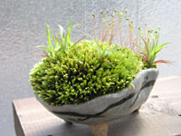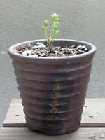 左の三角鉢は多分南天。手前のミニ鉢に植えたのは謎の植物。