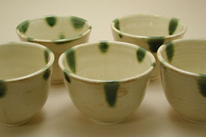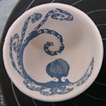 今日は、ご飯茶碗5個に釉掛け。ぐい呑み6個に蛸の絵付けをしてみた。