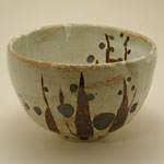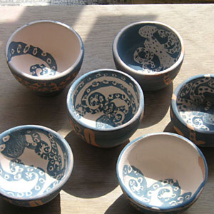 素焼き用白化粧を試させてもらった。筆で描いてから、竹べらで掻き落としてみた。普通の生掛けする白化粧ではできない風合いがでて面白い。