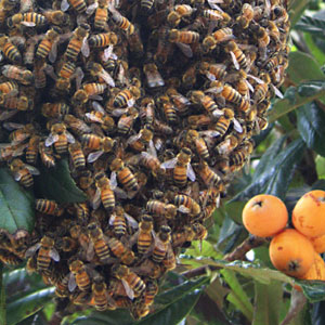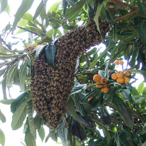 枇杷の枝にミツバチの塊がもわもわと。