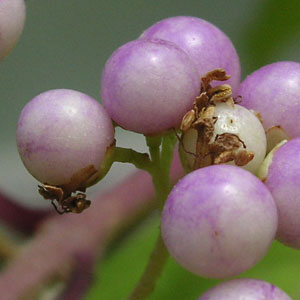 ●コムラサキの実を近くで見ると、まだおしべや花びらがこびりついている。