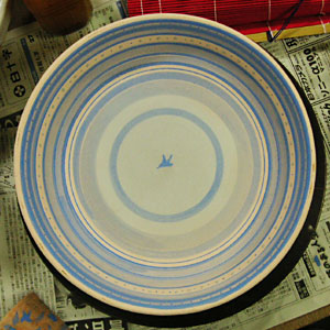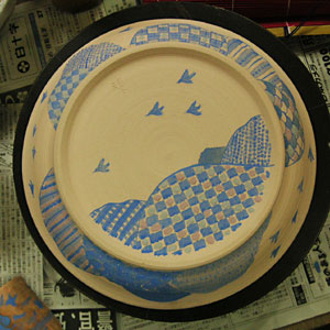 直径28センチの皿、白く焼き上がる五斗蒔土で作ったもの、に絵付けした。
