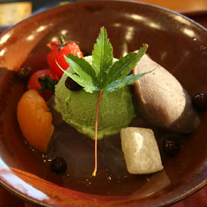 抹茶あんみつ。今年はまだモミジが青々している。紅いものはミニトマトだったのが面白い。