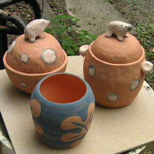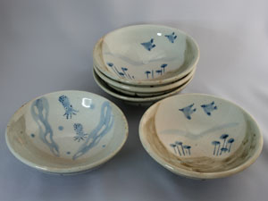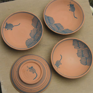 今日は素焼き棚にたまっていた小皿やフタものに絵付けして釉掛けする計画。