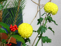 ●雪をかぶった富士山がクリアに見えて、目出度さ万倍なのが面白い。 ●昨日、剣山に指を突き刺しつつ頑張って生けた松と菊と千両。