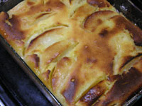耐熱容器にリンゴを並べて、上からケーキ種を注ぐ。