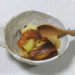 リンゴはくし形に切って、半個分のレモン汁と砂糖カレースプーンに山盛り一杯くらいをまぶしておく。