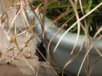 枯れ草にぶら下がっているので、この鉢は植え替えできない。