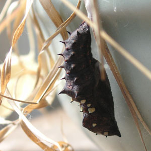 ようやく一匹、スズメノヤリの鉢の陰でサナギになっているのを発見した。
