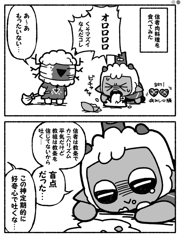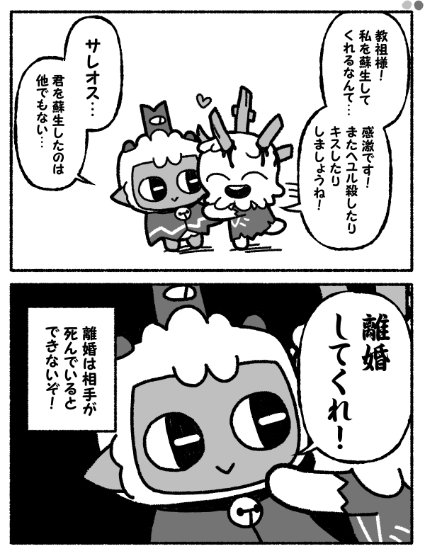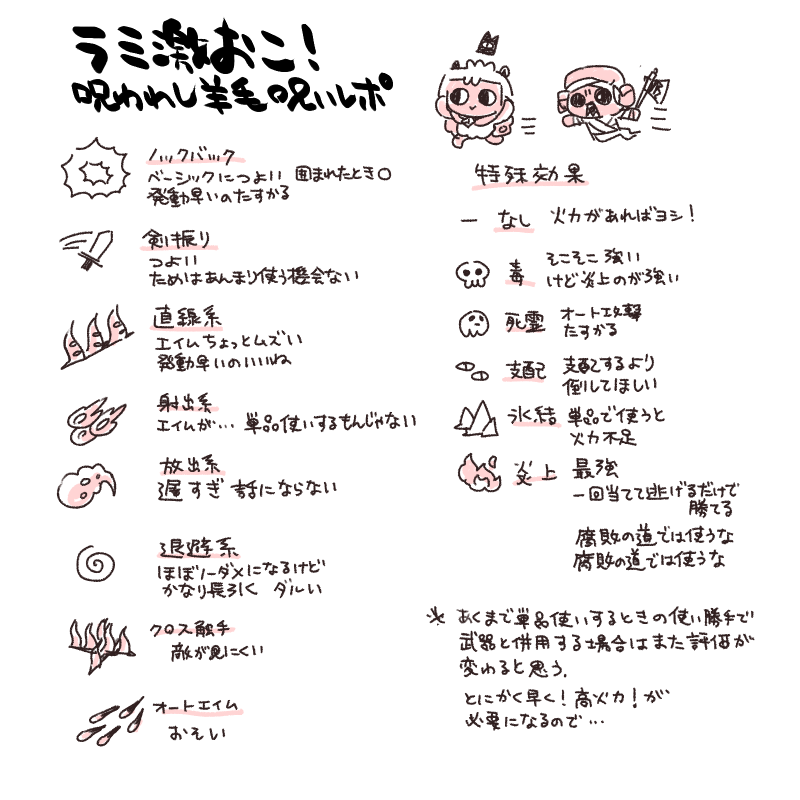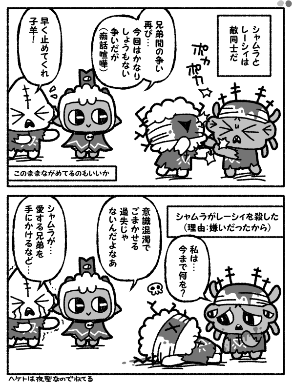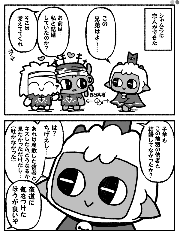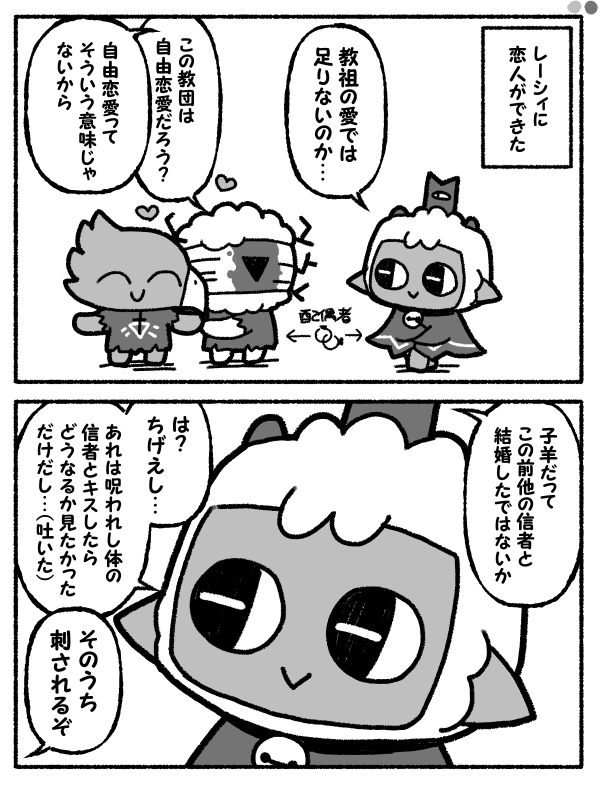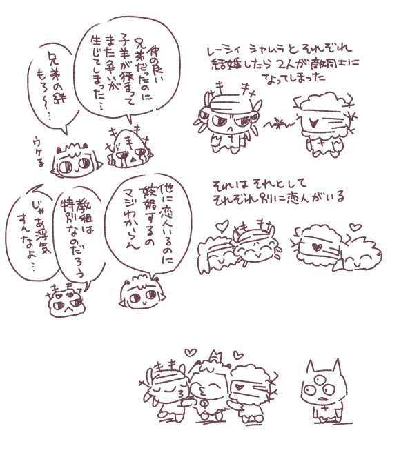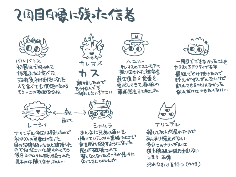 ホーム > Cult of the Lamb / その他ゲーム Cult of the Lamb落書き詰め合わせ(7) 2周目のネタとそれとは関係ないネタ含む 離婚しようと思ってたら老衰で死んじゃってぇ… 最初にもらえるタロットがあんなに充実してるとは思わなかった 腐敗の道、炎上が効かない敵も多いのでよくない 呪われし聖騎士の羊毛は使うボタンが減るので下手くそにやさしいけど戦闘は単調になります 2周目はナリンデル殺したけど???からもらえるんですねコイツ ナリンデル教団に入れられたと思ったら死んだはずのきょうだい達がいて子羊と結婚してるの混乱しただろうな 理由:嫌いだったから じゃないんだよな 1周目は司教と結婚しなかったので2周目はした そしたらひどいことになったシャムラは雪ヒツジとも戦うよ(完全にボケ老人になってしまった…) そういやネズムって待ち受けしものがどうなったのか知らないのかな サリエルの服着てってもネズムが反応してくれませんでしたなので捏造しました ケツの毛までむしったように見せかけよう! なぜハガルと子どもを作らせたかというと、真っ先にくっついたからです(いいのか?)(いいか…) 加入する司教とすでに馴染んだ司教でギャップがあってほしい あらかた描いたので多分これで終わり カテゴリー:Cult of the Lambその他ゲーム タグ:落書き詰め合わせ シェアする Twitter でシェア LINE でシェア 関連投稿 FEぜんぶ / 幻影異聞録♯FE 幻影異聞録♯FE落書き詰め合わせ(4) Cult of the Lamb / その他ゲーム Cult of the Lamb落書き詰め合わせ(2) Cult of the Lamb / その他ゲーム Cult of the Lamb落書き詰め合わせ(1) 前の投稿 Cult of the Lamb落書き詰め合わせ(6)